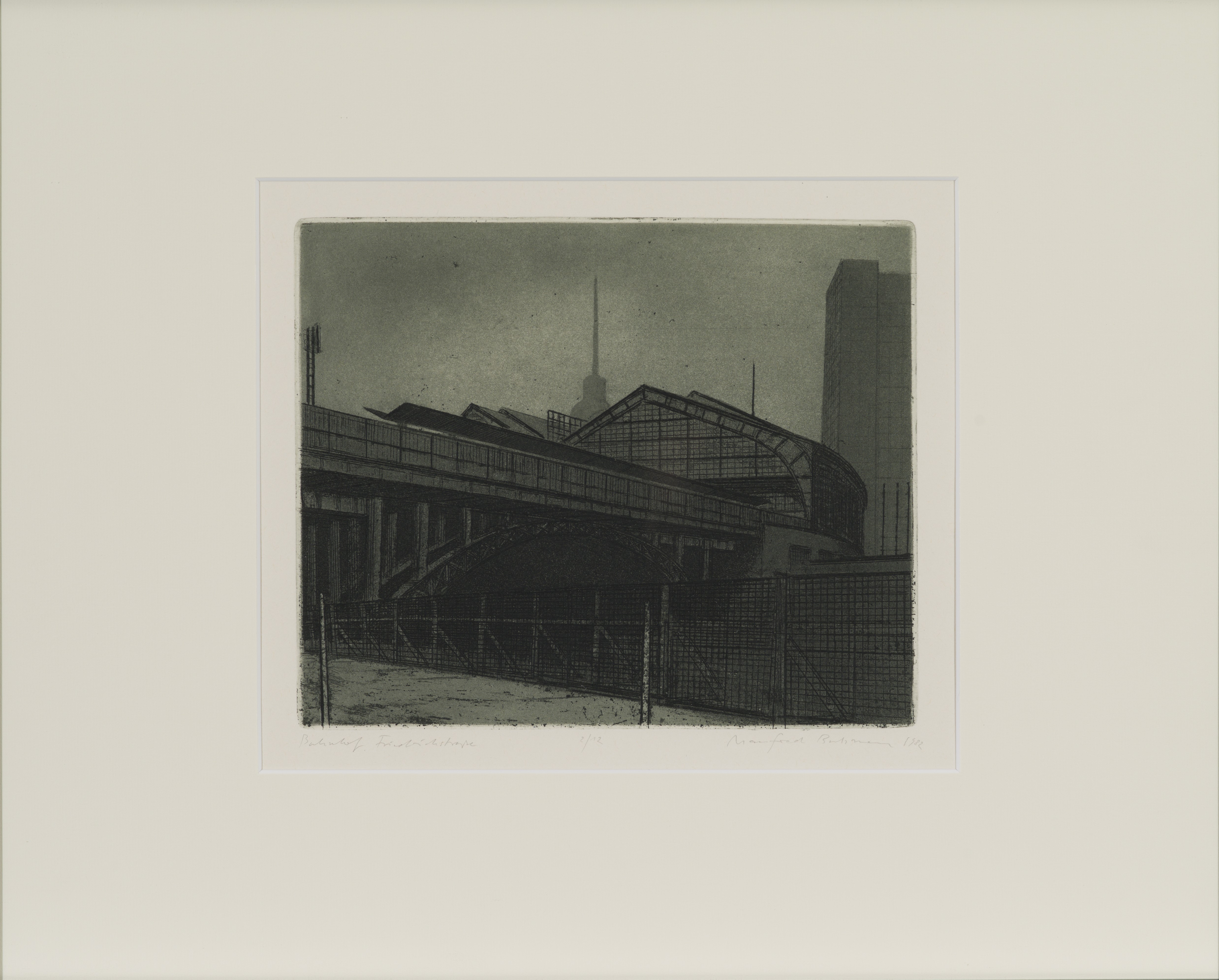 Manfred Butzmann, Bahnhof Friedrichstraße (aus der Mappe: Steinernes Berlin I, Blatt 17), 1982, Aquatint etching on Hahnemühle laid paper, 30,5 x 35,8 cm, Kunstsammlung der Berliner Volksbank K 1085 © VG Bild-Kunst, Bonn 2025, Photo: Peter Adamik