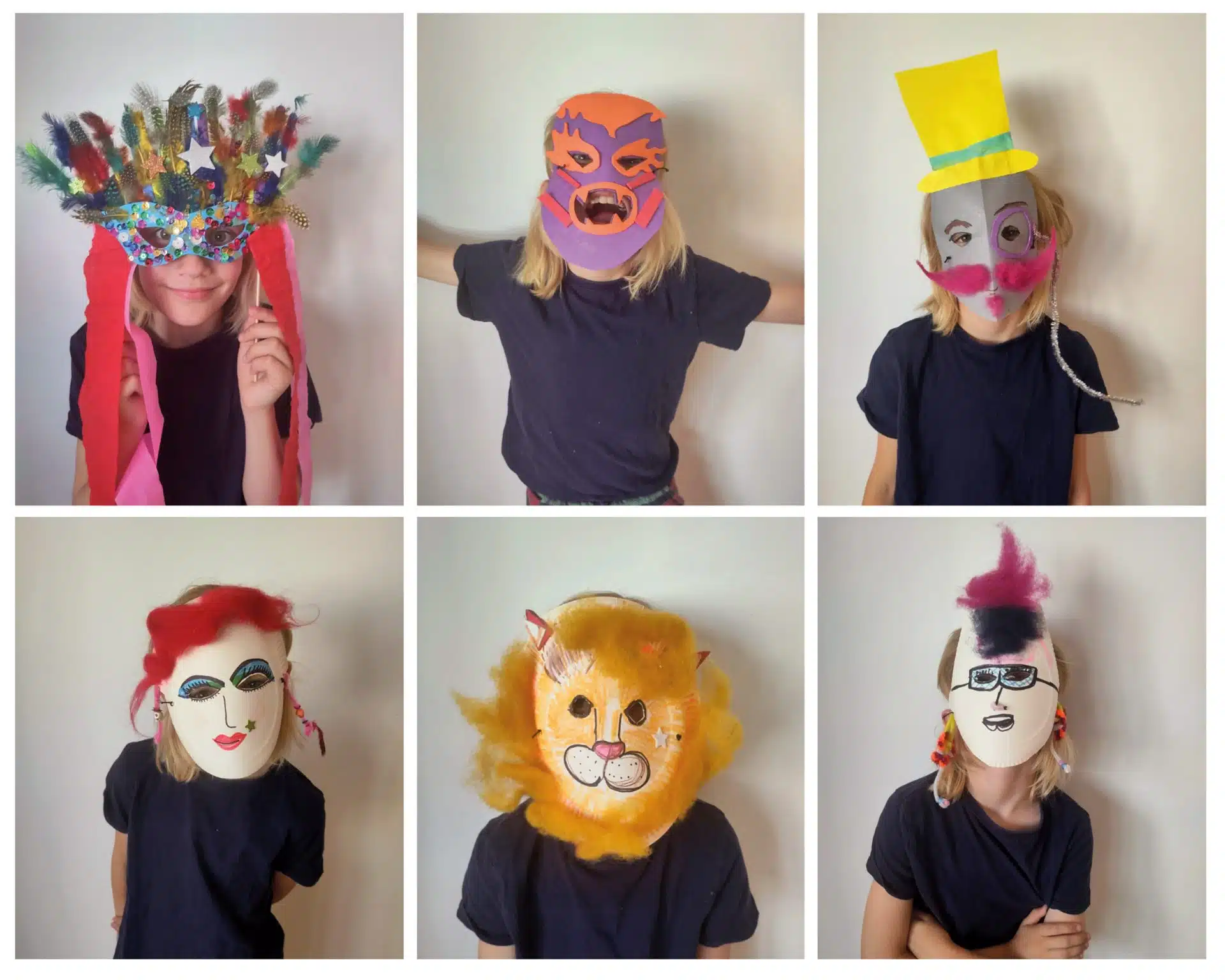 Im kreativen Teil geht es darum durch Verfremdung des Ichs und die Inszenierung ein „künstlerisches“ Klassenfoto entstehen zu lassen. Die Teilnehmenden arbeiten haptisch an ihrer „Verfremdung“ und basteln aus Papptellern, bunten Papieren, Stoffresten und anderen Materialien Masken zu einem bestimmten Thema. Für die jüngeren Gruppen werden dies Zirkus oder Karneval der Tiere sein. Ältere Kinder arbeiten zum Nachtcafé von Hubertus Giebe. Wie würde eure Klasse aussehen, wenn ihr alle Mitglieder eines Zirkus währt, am Karneval der Tiere teilnehmen oder Besucher des Nachtcafés auf dem Gemälde von Hubertus Giebe sein würdet?